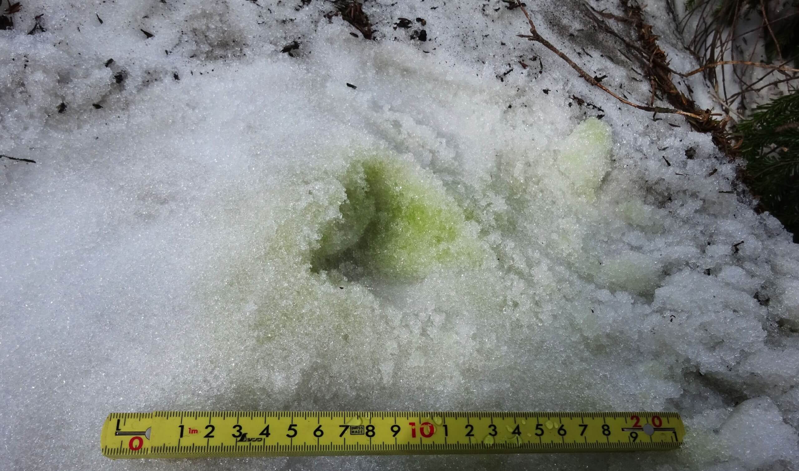 (上) 青森県の八甲田山で見つけた緑色の彩雪 (2017年5月23日撮影)。