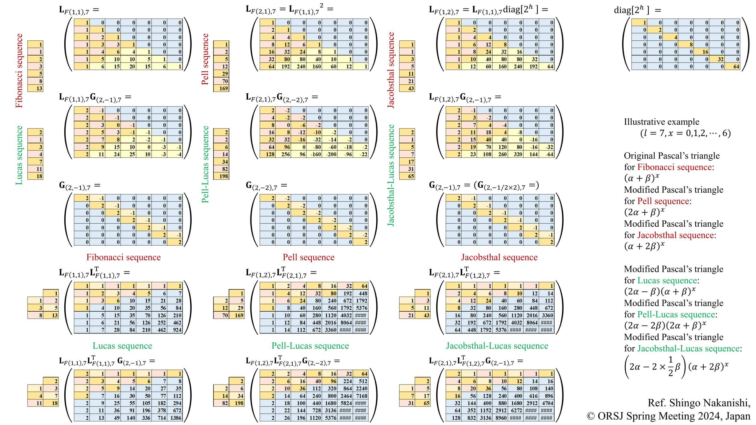 「修正パスカル三角形によるスキップ型フィボナッチ数列とリュカ数列の演算行列」(2024)『日本オペレーションズ・リサーチ学会2024年春季研究発表会アブストラクト集』2-B-8p.1-2.