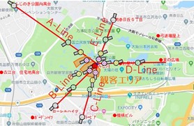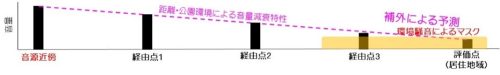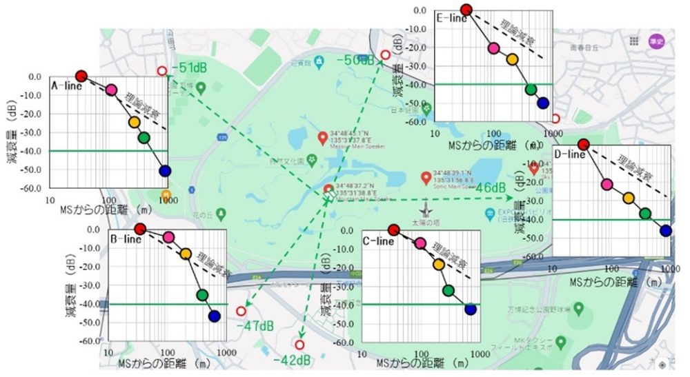 この結果,上図に示されるように各方面での居住区までの距離減衰(図中青丸)は,公園内の木々や傾斜の影響で一般的な理論距離減衰よりも音量低減が大きいことが明らかになった.また,様々な気候条件の違いがある場合においても最小でも40dB以上の減衰(図中緑線)が見込まれることもわかった.このことから居住区において大阪府が定める騒音環境基準となる55dBを満たすには会場内の上限レベルを95dBとすることが適切であると判断した.