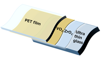 図2に表面保護膜として近赤外透過PETフィルム装着した写真と構造図を示す。評価は、ZrO2バッファ層を形成したNb添加VO2薄膜を用いた