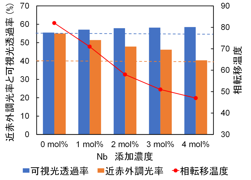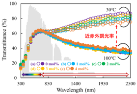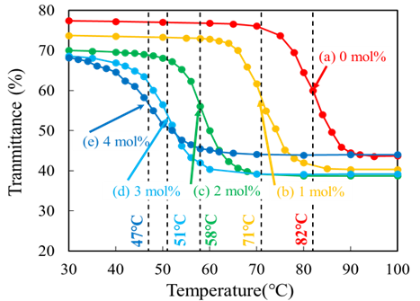 (100 ℃と30 ℃の最大透過率差) を示す。可視光透過率は55%以上、 近赤外最大調光率は,40%以上、相転移温度は、47℃以下に低温化することができた。