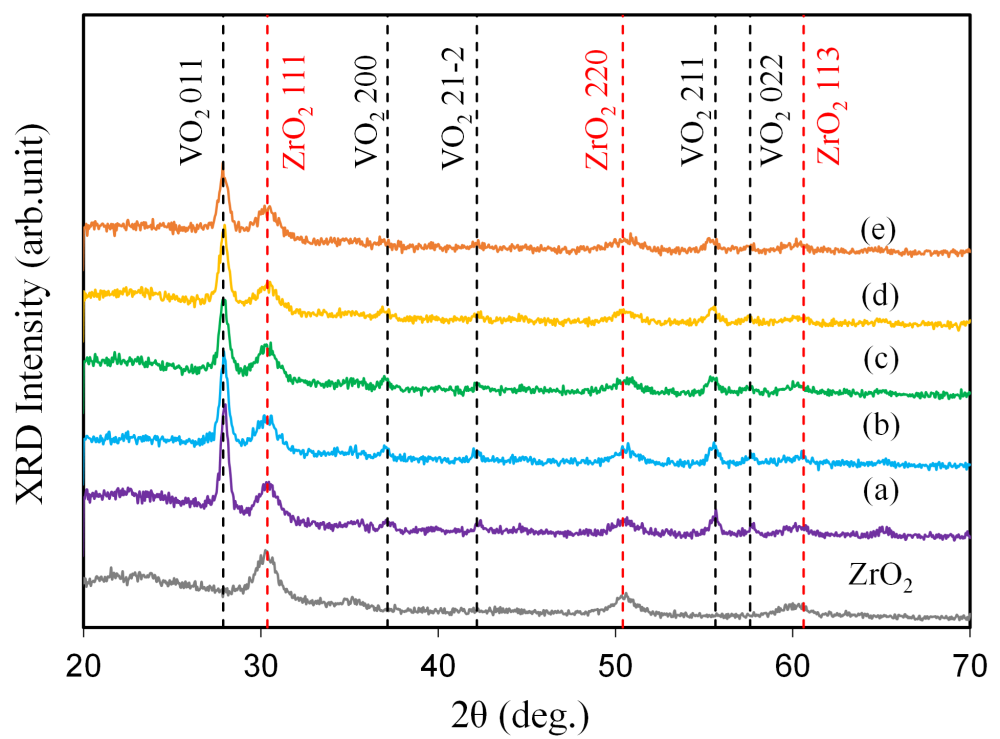 (Grazing incidence X-ray diffraction: 微小角入射測定 ) パターンを示す。0 ~ 4 mol% Nb添加薄膜はすべてにおいてVO2 011, 211 が主要ピークとして検出され、単一組成のVO2多結晶薄膜の成長が確認された